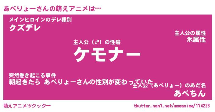 | 女子向けラノベタイトル風あだ名 | 『誰かこのあべりょーを説明してください! ~契約から始まるウェディング~』 |