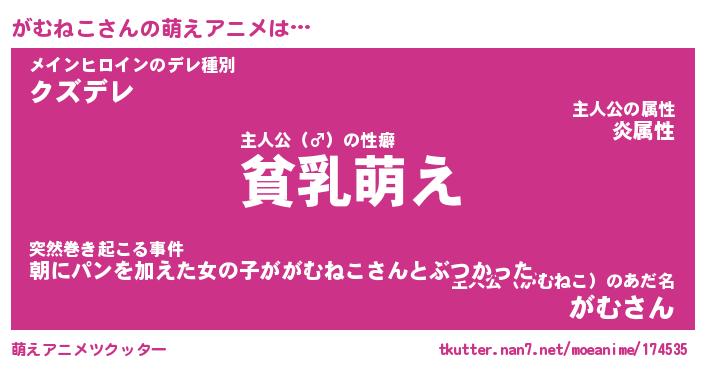 | 男性向けラノベタイトル風あだ名 | 『がむねこの憂鬱』 |