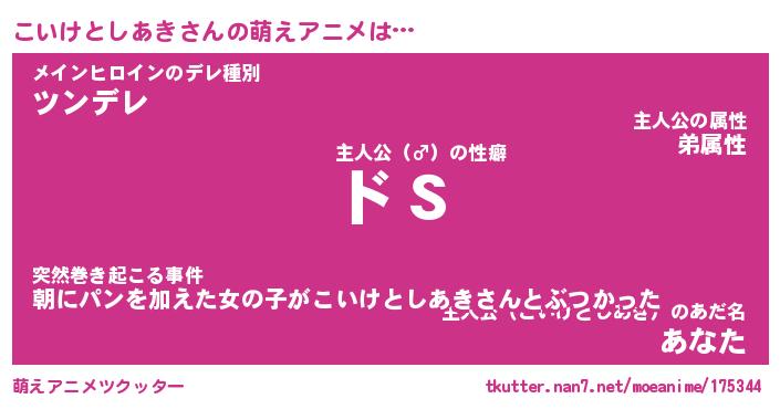 | 女子向けラノベタイトル風あだ名 | 『(仮)こいけとしあきのやんごとなき事情』 |