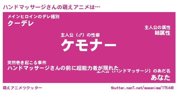| 男性向けラノベタイトル風あだ名 | 『ハンドマッサージアートオンライン』 |