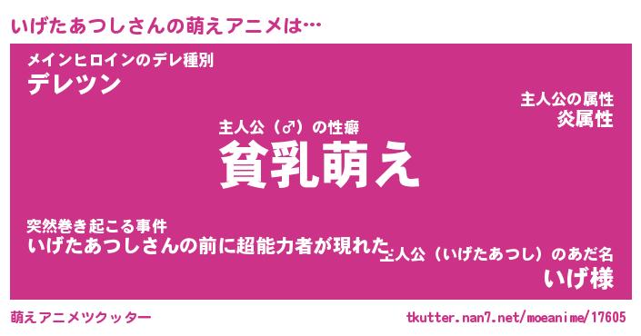 | 女子向けラノベタイトル風あだ名 | 『(仮)いげたあつしのやんごとなき事情』 |