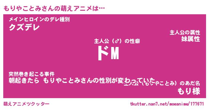 | 女子向けラノベタイトル風あだ名 | 『(仮)もりやことみのやんごとなき事情』 |