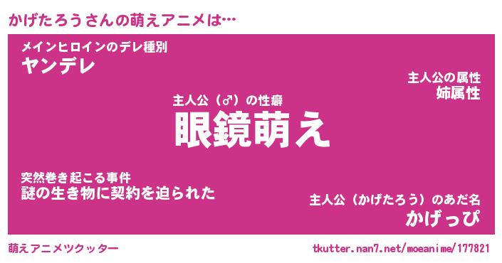 | ヘコむあだ名 | 『かげにゅー』『つくし』『かげ太郎』 |