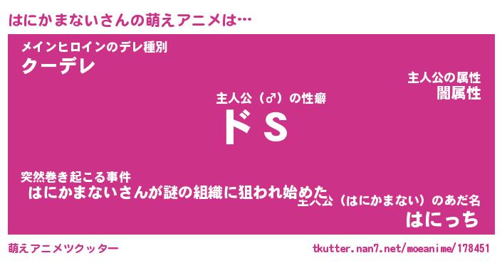 | 男性向けラノベタイトル風あだ名 | 『はにかまないの憂鬱』 |