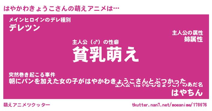 | 男性向けラノベタイトル風あだ名 | 『はやかわきょうこの憂鬱』 |