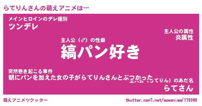 | 男性向けラノベタイトル風あだ名 | 『らてりんの憂鬱』 |