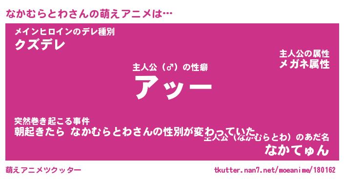 | 女子向けラノベタイトル風あだ名 | 『誰かこのなかむらとわを説明してください! ~契約から始まるウェディング~』 |