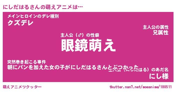 | 男性向けラノベタイトル風あだ名 | 『にしだはるの憂鬱』 |