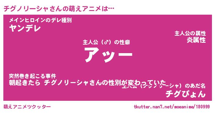 | 男性向けラノベタイトル風あだ名 | 『チグノリーシャアートオンライン』 |