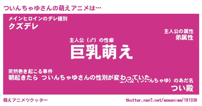 | 男性向けラノベタイトル風あだ名 | 『ついんちゃゆの憂鬱』 |