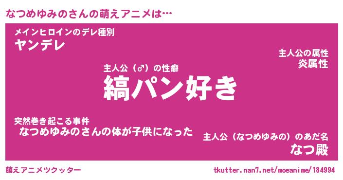 | 男性向けラノベタイトル風あだ名 | 『なつめゆみのの憂鬱』 |