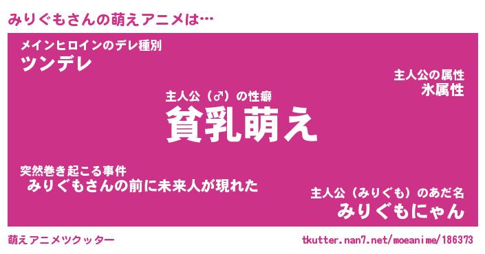 | 女子向けラノベタイトル風あだ名 | 『(仮)みりぐものやんごとなき事情』 |