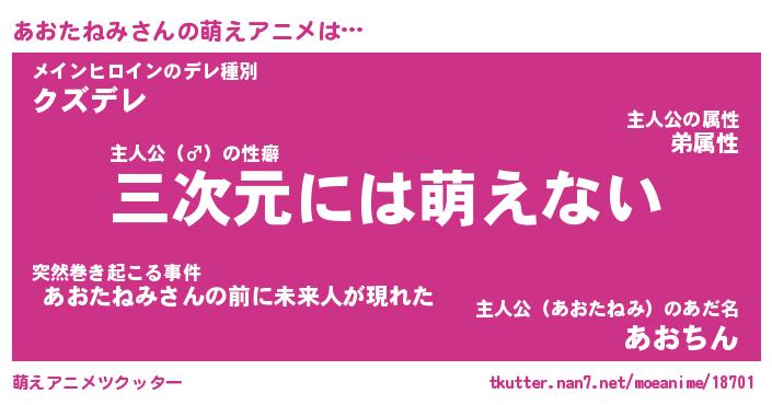 | 男性向けラノベタイトル風あだ名 | 『アオタネミアートオンライン』 |