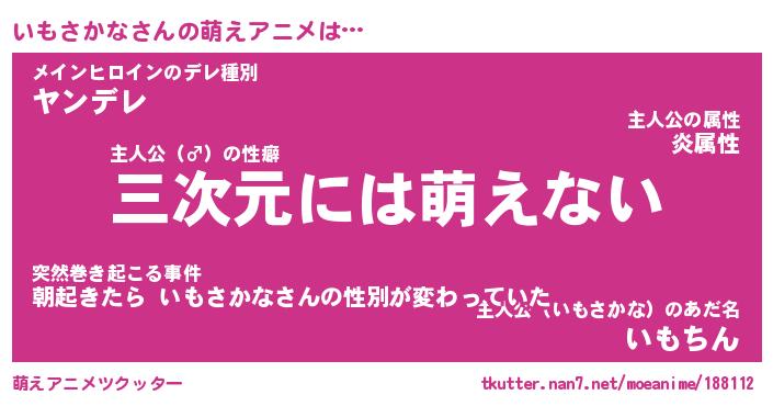 | 男性向けラノベタイトル風あだ名 | 『イモサカナアートオンライン』 |