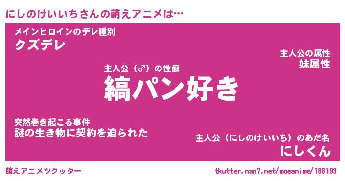 | 男性向けラノベタイトル風あだ名 | 『にしのけいいちの憂鬱』 |