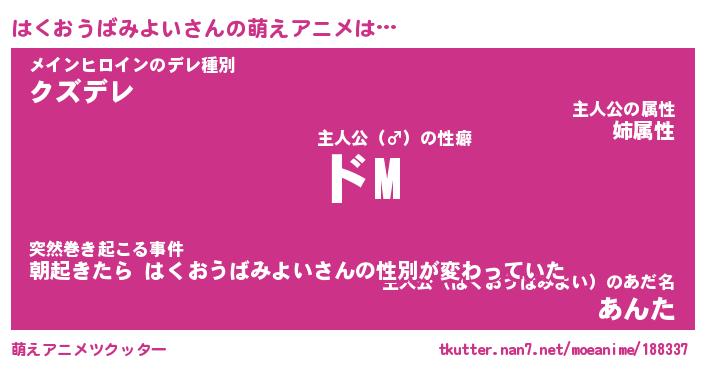 | 男性向けラノベタイトル風あだ名 | 『はくおうばみよいの憂鬱』 |