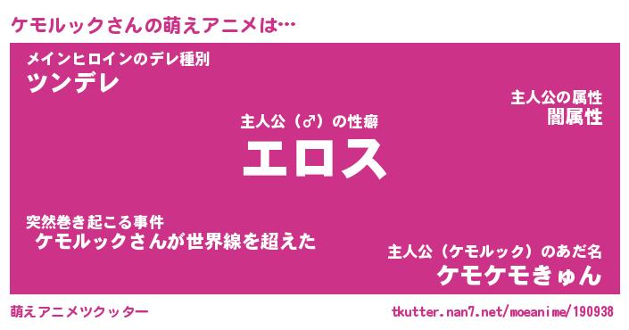 | 男性向けラノベタイトル風あだ名 | 『ケモルックアートオンライン』 |