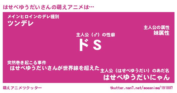 | 男性向けラノベタイトル風あだ名 | 『はせべゆうだいの憂鬱』 |