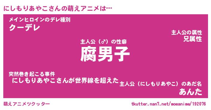 | 肩書あだ名 | 『にしもりあやこ御曹司』 |