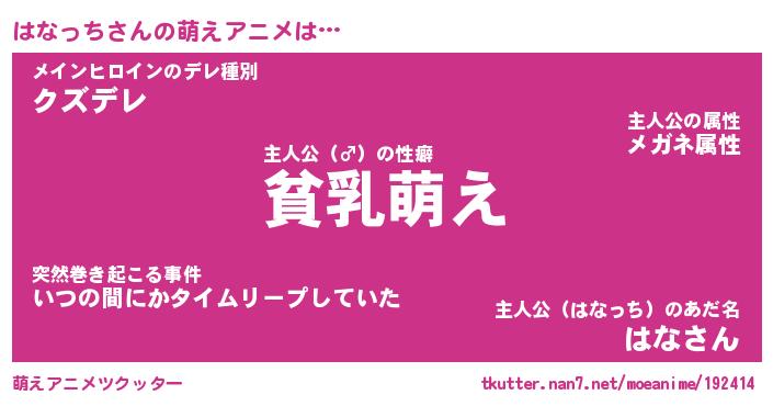 | 男性向けラノベタイトル風あだ名 | 『はなっちの憂鬱』 |