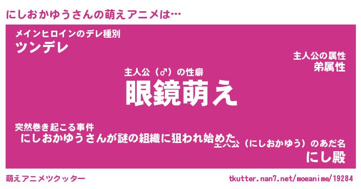| 男性向けラノベタイトル風あだ名 | 『にしおかゆうの憂鬱』 |