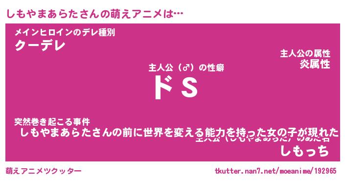 | 女子向けラノベタイトル風あだ名 | 『(仮)しもやまあらたのやんごとなき事情』 |