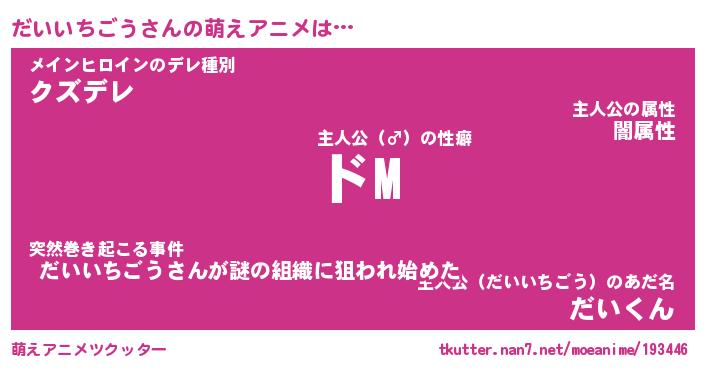 | 女子向けラノベタイトル風あだ名 | 『(仮)だいいちごうのやんごとなき事情』 |