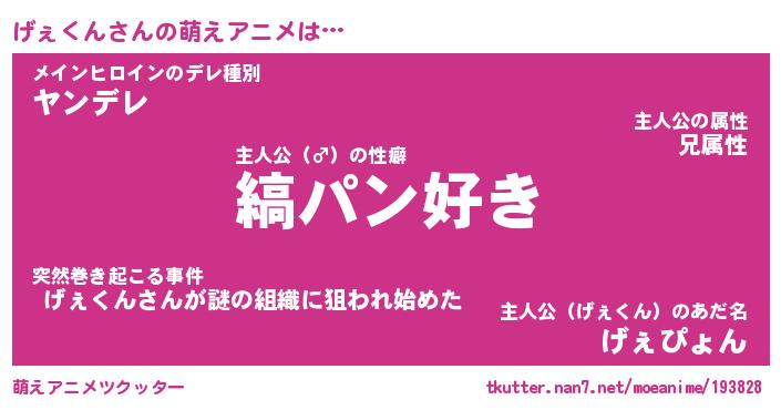 | 意味不明あだ名 | 『ペロリンげぇくん』『永久保存げぇくん』 |