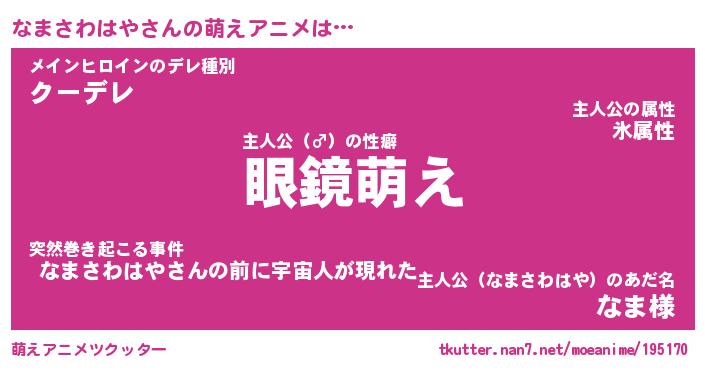 | 男性向けラノベタイトル風あだ名 | 『なまさわはやの憂鬱』 |