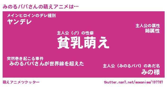 | 男性向けラノベタイトル風あだ名 | 『みのるパパの憂鬱』 |