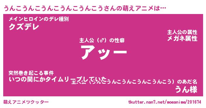 | 女子向けラノベタイトル風あだ名 | 『誰かこのうんこうんこうんこうんこうんこうを説明してください! ~契約から始まるウェディング~』 |