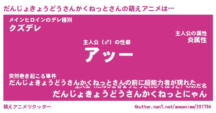 | 胡散臭い通販商品みたいなあだ名 | 『億万長者になれるブレスレット…その名も「だんじょきょうどうさんかくねっと」』 |