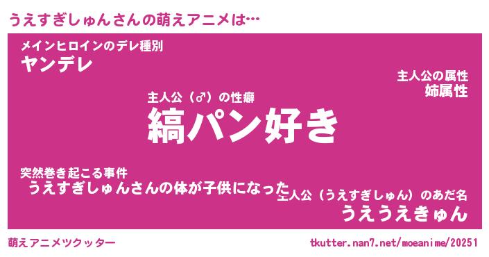 | 男性向けラノベタイトル風あだ名 | 『うえすぎしゅんの憂鬱』 |