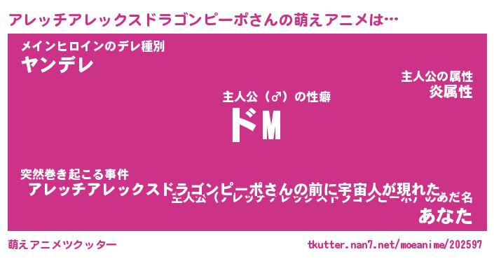 | 男性向けラノベタイトル風あだ名 | 『アレッチアレックスドラゴンピーポの憂鬱』 |