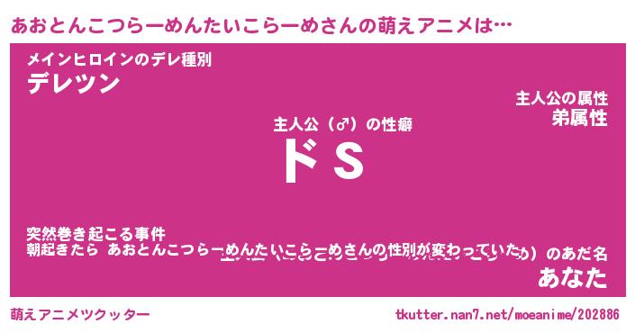 | 女子向けラノベタイトル風あだ名 | 『(仮)あおとんこつらーめんたいこらーめのやんごとなき事情』 |