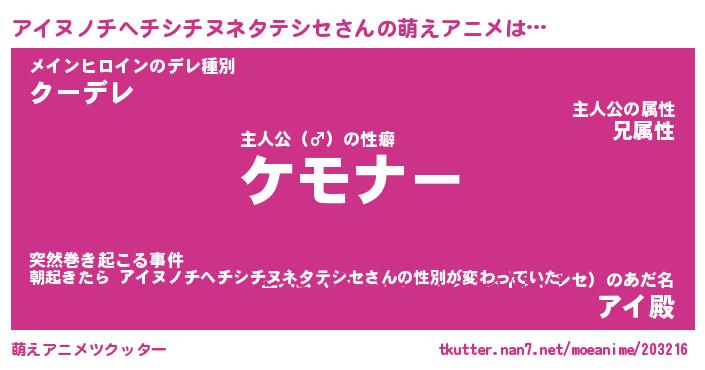 | 女子向けラノベタイトル風あだ名 | 『誰かこのアイヌノチヘチシチヌネタテシセを説明してください! ~契約から始まるウェディング~』 |