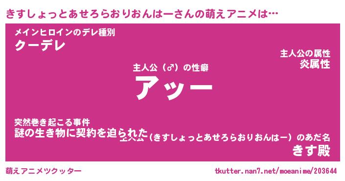 | 肩書あだ名 | 『きすしょっとあせろらおりおんはー御曹司』 |
