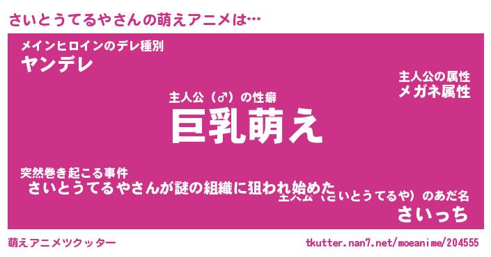 | 男性向けラノベタイトル風あだ名 | 『さいとうてるやの憂鬱』 |