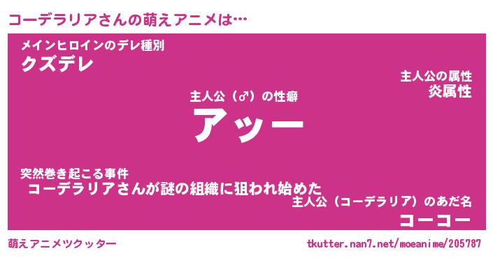 | 女子向けラノベタイトル風あだ名 | 『誰かこのコーデラリアを説明してください! ~契約から始まるウェディング~』 |