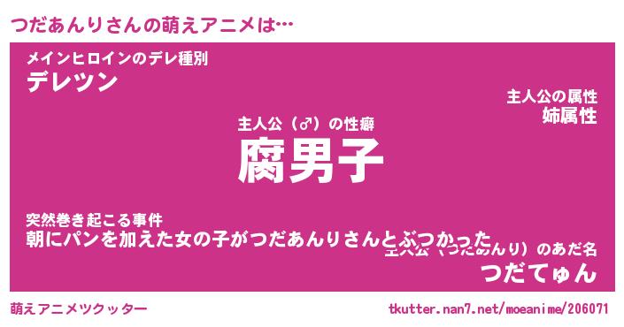| 男性向けラノベタイトル風あだ名 | 『ツダアンリアートオンライン』 |
