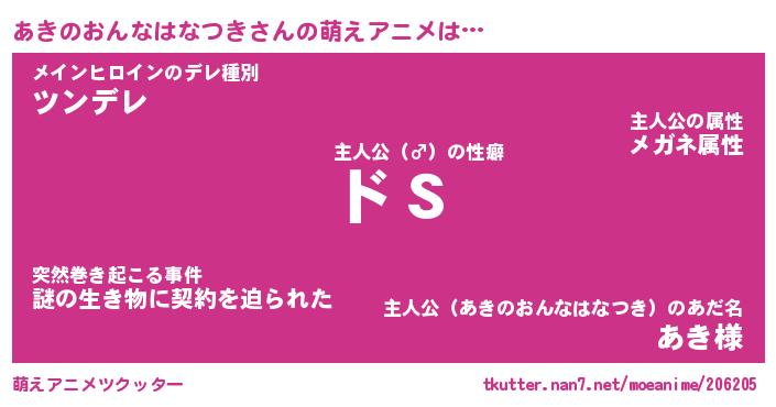 | 男性向けラノベタイトル風あだ名 | 『あきのおんなはなつきの憂鬱』 |