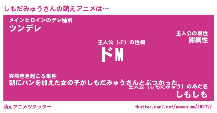 | 男性向けラノベタイトル風あだ名 | 『しもだみゅうの憂鬱』 |