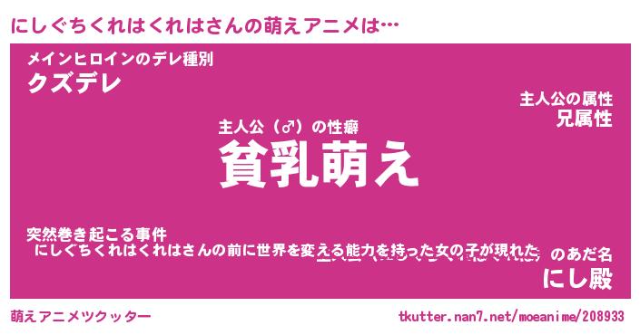 | 女子向けラノベタイトル風あだ名 | 『(仮)にしぐちくれはくれはのやんごとなき事情』 |
