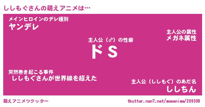 | 男性向けラノベタイトル風あだ名 | 『ししもぐの憂鬱』 |