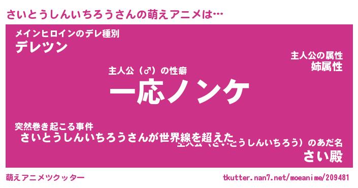 | 女子向けラノベタイトル風あだ名 | 『誰かこのさいとうしんいちろうを説明してください! ~契約から始まるウェディング~』 |