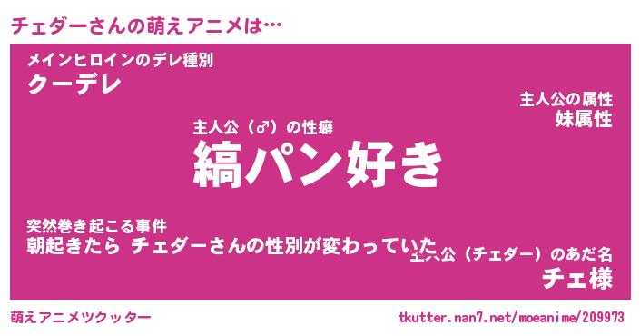 | 男性向けラノベタイトル風あだ名 | 『チェダーの憂鬱』 |