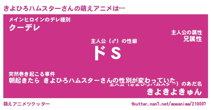 | 男性向けラノベタイトル風あだ名 | 『きよひろハムスターの憂鬱』 |