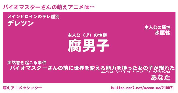 | 料理風あだ名 | 『節約★バイオマスターと油揚げの玉子丼』 |