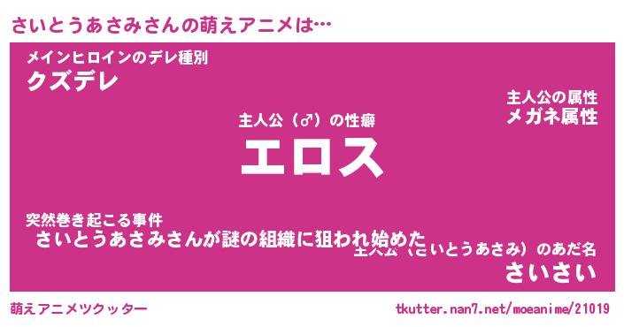 | 女子向けラノベタイトル風あだ名 | 『誰かこのさいとうあさみを説明してください! ~契約から始まるウェディング~』 |