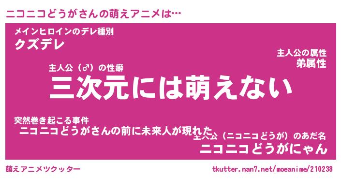 | 女子向けラノベタイトル風あだ名 | 『ニコニコどうが姫と円卓の騎士』 |